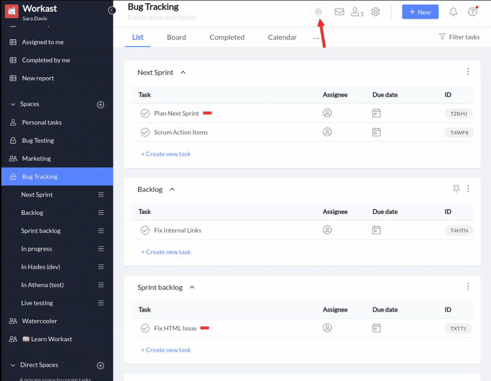 In order to manage and organize your bug tracking initiatives, first, you will want to create a space to hold them in. Conveniently, in Workast - these are called spaces. A space is basically an over-arching project that is then broken down into lists, and tasks. Spaces can be created for any type of project your team is working on. For your bug tracking space, you will start by creating the space in Workast, and naming it to fit your organization's naming-convention models.