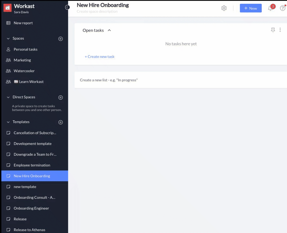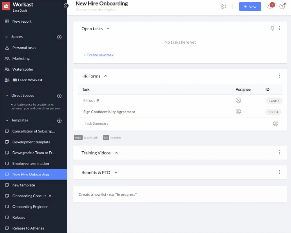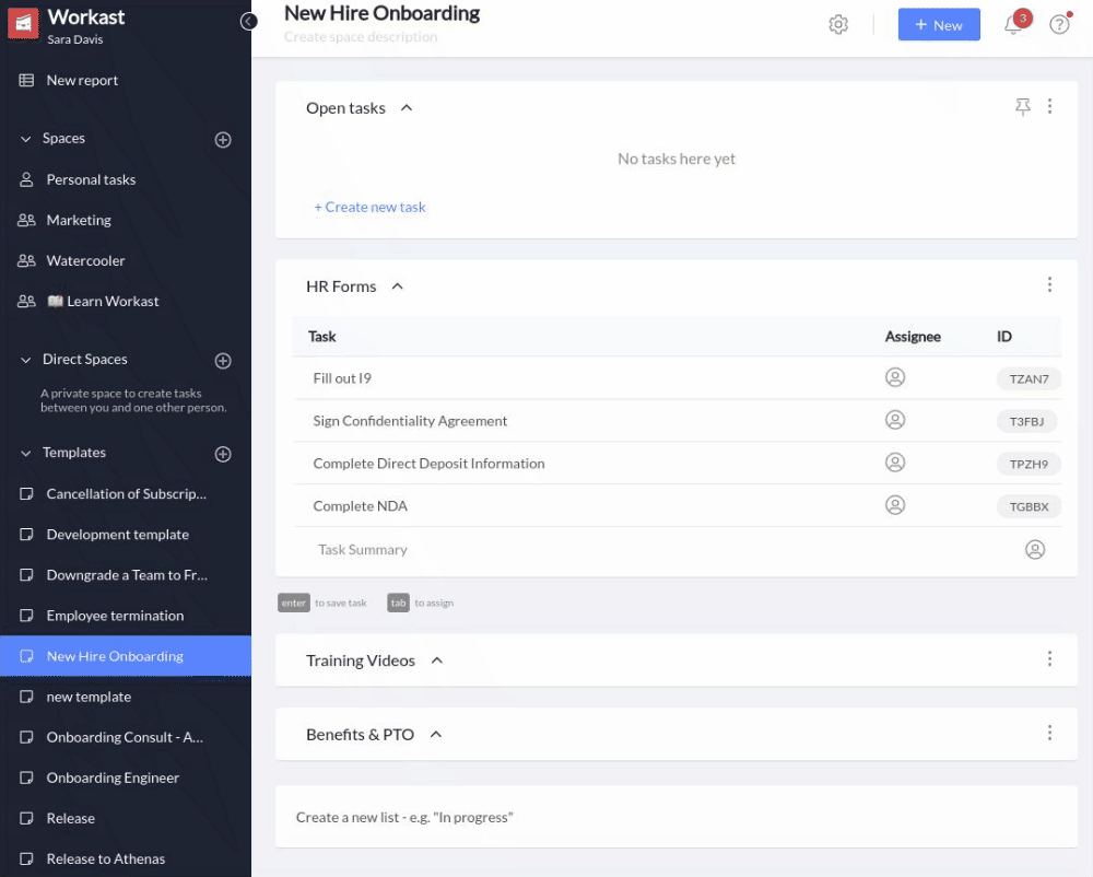 First, you'll want to gather any documents, training videos, forms, and all other pieces of collateral that are a part of your new hire onboarding process to have them on hand to easily transfer them into Workast. As the process for new hires tends to be repetitive, we recommend creating a new hire template. This way, it can be replicated whenever you hire for a new position.