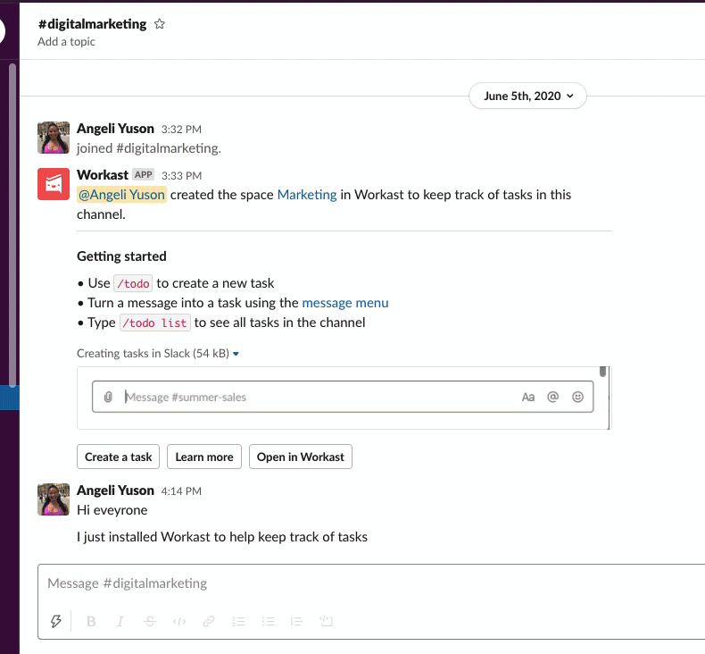 Tasks are shown both in Slack and in the Workast web app. To view the Workast tasks in a Slack channel, click on the channel where the tasks were created