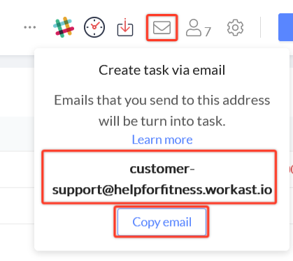 Finding the email address for you space- To find the email address to use to create a task in your space, click on the envelope icon in the top right of your space.