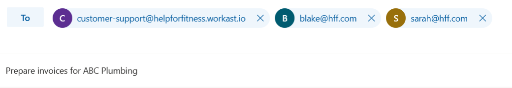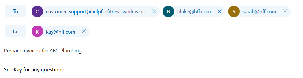 - To assign the task you are creating, add the email of the assignee(s) as additional recipients. For example, if I wanted to assign the task "Prepare invoices for ABC Plumbing" in the customer support space to both Blake and Sarah, the email I would send would look like this: