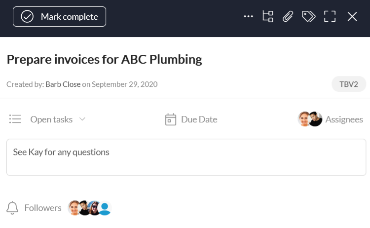 - Along with adding assignees, you can also add task followers. Simply add the email of anyone you want to add as a task follower in the CC section of your task creation email. So, if I wanted to assign Kay as a follower to the above task, and add a description that she was following the task to help with questions, the email I would send would look like this: